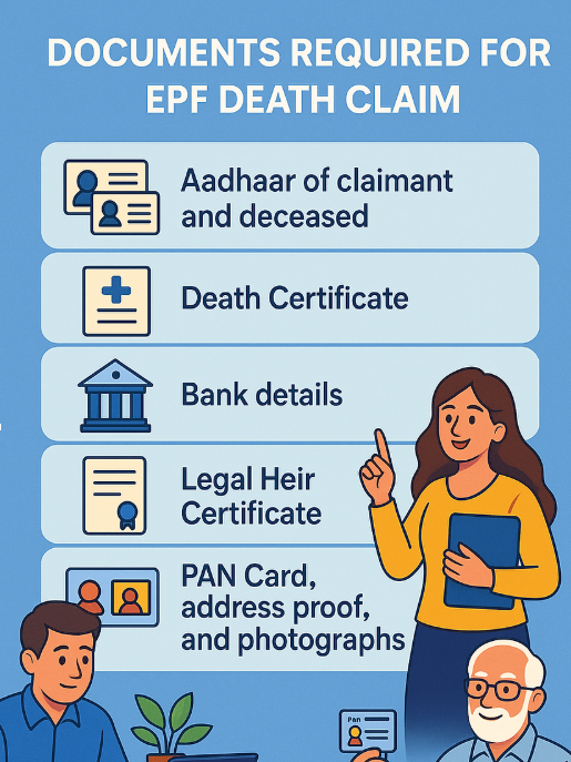 Key documents include: death certificate, Aadhaar of claimant and deceased, bank details, legal heir certificate (if no nominee), PAN, address proof, photographs, and employer certification if applicable.